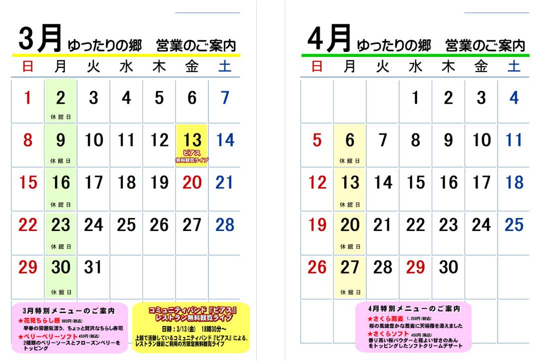 ゆったりの郷 営業カレンダー(3,4月)